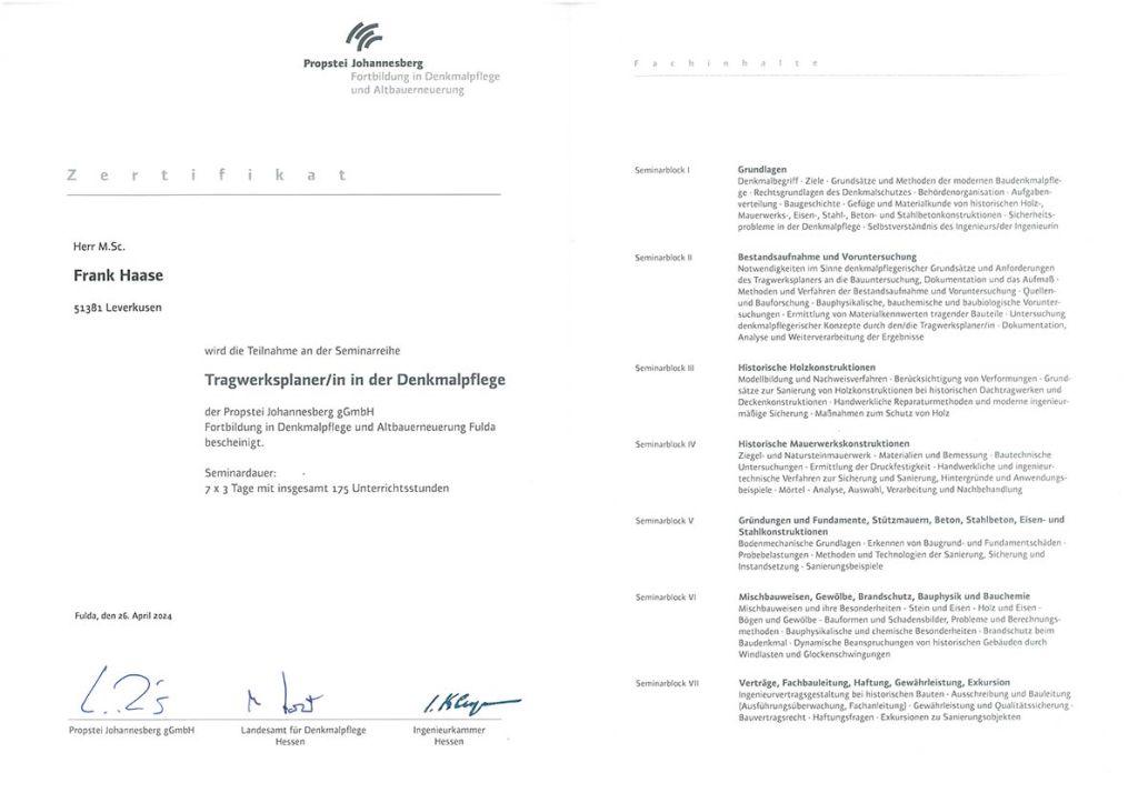 Durch regelmäßige Fort- und Weiterbildungen bleibe ich auf dem aktuellen Stand der technischen Entwicklung. Zuletzt habe ich die zertifizierte Fortbildungsreihe „Tragwerksplanung in der Denkmalpflege“ besucht, welche in der Propstei Johannesberg bei Fulda angeboten wird.